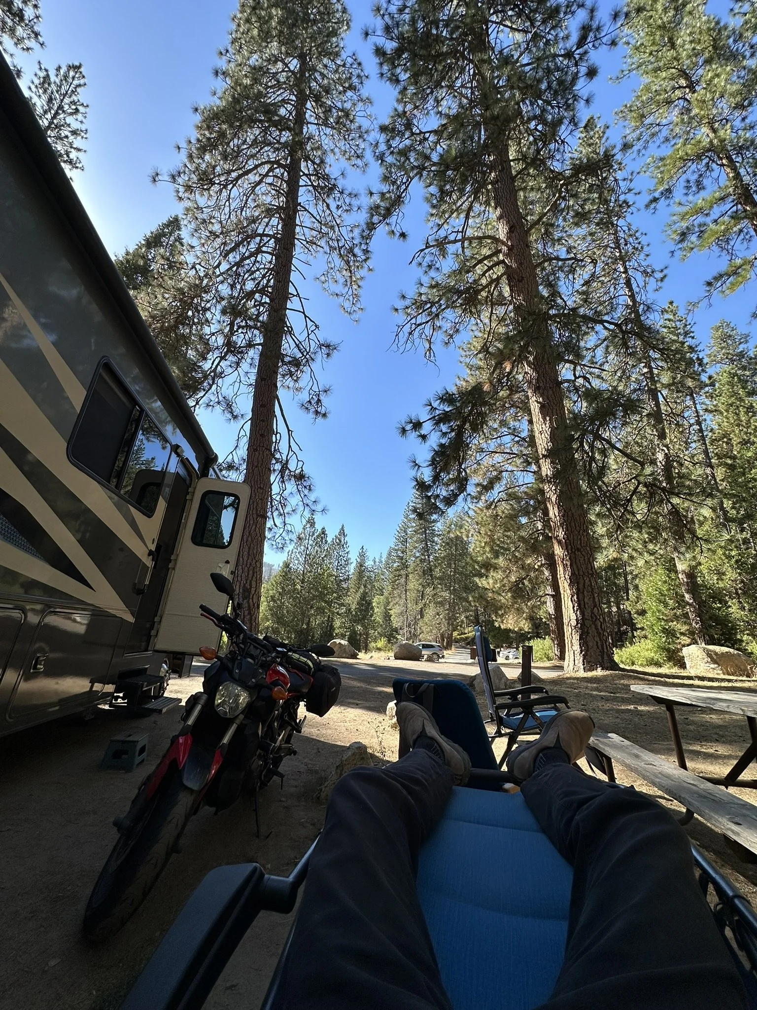 The first day was fairly boring. I left later than I wanted so I hit some of the Friday afternoon rush hour. To make things worse there was a wreck earlier where the highway narrowed into a smaller twisty mountain highway. I had fun lane splitting for 30~45 minutes, including zooming past my siblings who joined on this trip, left before I did, but were stuck in traffic. The views of the fields before reaching the Sierras as well as the Sierras themselves were just gorgeous with the setting sun. I ended up getting to the RV a good hour before my siblings.